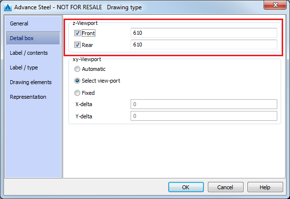 - The Drawing type window opens and in the Detail box tab, you can find the Z-Viewport parameters.