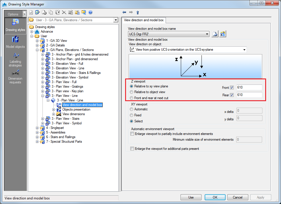 - The View direction and model box tab opens and here you can find the Z-Viewport parameters.