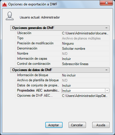 Pulse Opciones si desea cambiar los parámetros, realice los cambios pertinentes y pulse Aceptar.
