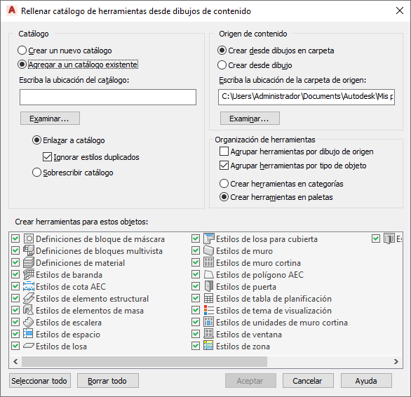 Peligro: Debe tener cuidado al utilizar esta opción, pues suprimirá todo el catálogo existente. Si sólo desea sobrescribir herramientas con las versiones actualizadas de un dibujo de contenido, seleccione en su lugar Enlazar a catálogo, y compruebe que no esté seleccionada la opción Ignorar estilos duplicados.