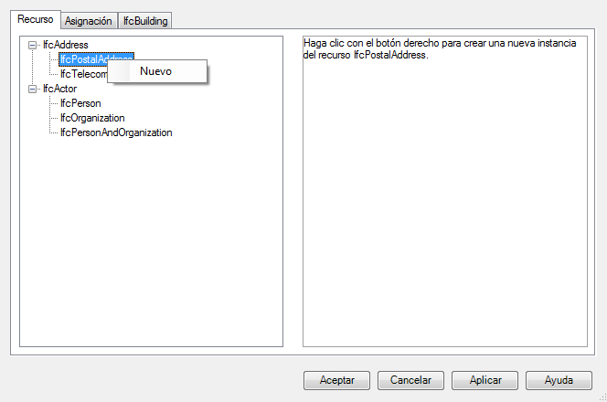 4. En el panel izquierdo del cuadro de diálogo, haga clic con el botón derecho en un recurso de IFC (por ejemplo, IfcPostalAddress) y, a continuación, haga clic en Nuevo.