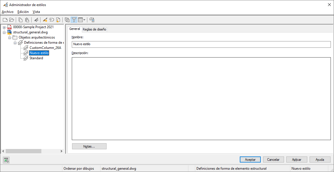 - Pulse Aceptar para agregar la nueva forma a la lista Definiciones de forma de elemento estructural y cerrar el Administrador de estilos.