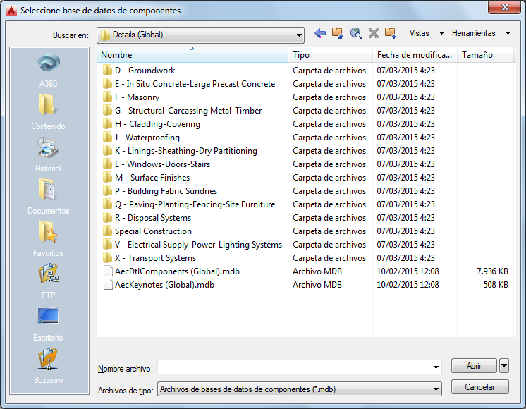 Utilice este procedimiento para agregar una base de datos a la lista de bases de datos de componentes de detalles activas, en las que los componentes se pueden seleccionar para su inserción, se pueden copiar en una paleta de herramientas o se pueden utilizar para modificar una herramienta existente.