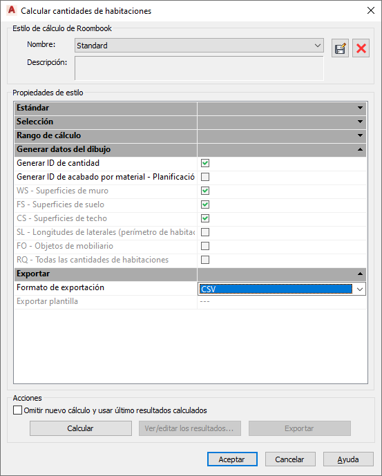 Inicia el proceso de exportación. La exportación de CSV genera un archivo para cada una de las categorías de cantidad de habitaciones. Cada archivo está precedido por el nombre del dibujo y el nombre del tipo de cálculo de Roombook.
