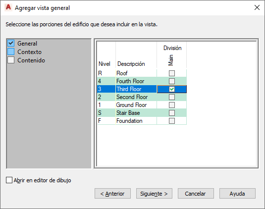 Siga este procedimiento para seleccionar partes del edificio para incluir en la vista mediante la asignación de niveles y divisiones. Es posible seleccionar varios niveles y divisiones para un dibujo de vista, por ejemplo, para generar una vista de todo el edificio. Se facilita el contexto para el dibujo de vista.
