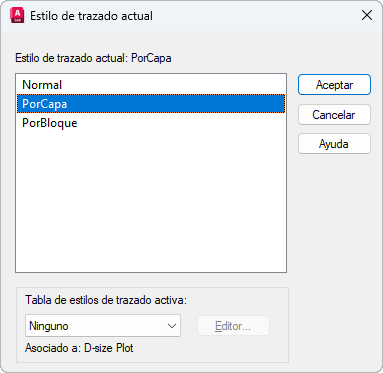 Muestra los estilos de trazado disponibles que se pueden asignar a un objeto, incluido el estilo de trazado por defecto, NORMAL. Un estilo de trazado es un conjunto de valores que anulan a los del color, simulación de color, escala de grises, asignaciones de plumillas, filtrado, tipo de línea, grosor de línea, estilos finales, unir estilos, estilos de relleno.