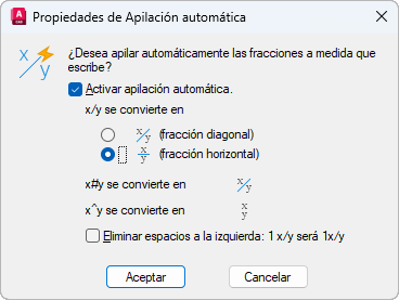 Apila automáticamente los caracteres numéricos escritos delante y detrás del carácter de intercalación, la barra oblicua o la almohadilla. Por ejemplo, si escribe 1#3 seguido de un carácter especial válido o de un espacio, el texto se apilará automáticamente como fracción diagonal.