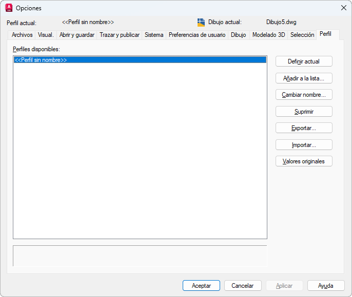 Muestra el cuadro de diálogo Cambiar perfil para cambiar el nombre y la descripción del perfil seleccionado. Utilice la opción Cambiar nombre si desea cambiar el nombre de un perfil conservando sus parámetros.