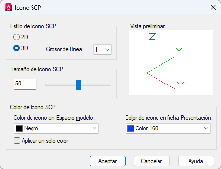 Controla el color del icono SCP en las ventanas gráficas del espacio modelo y en las fichas de presentación.