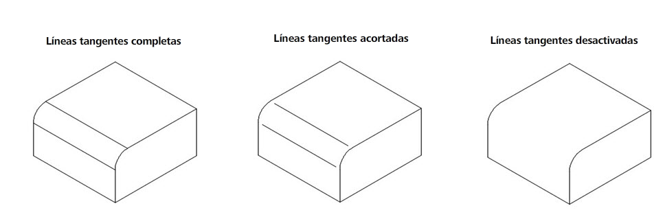 Activa y desactiva la visibilidad de las aristas tangentes. Las aristas tangentes marcan la transición entre una superficie plana y una arista redondeada, que se suelen encontrar como aristas de empalme.