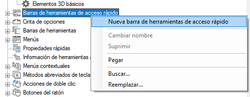 - En la ficha Personalizar, en el panel Personalizaciones en <nombre de archivo>, haga clic con el botón derecho en el nodo Barras de herramientas de acceso rápido. Haga clic en Nueva barra de herramientas de acceso rápido.