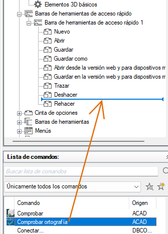 - En el panel Lista de comandos, arrastre el comando o el control que desee añadir a la barra de herramientas de acceso rápido del panel Personalizaciones en <nombre de archivo>.