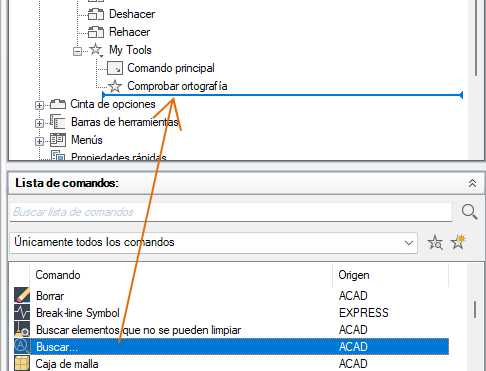 - En el panel Lista de comandos, arrastre el comando o el control que desee añadir al menú desplegable del panel Personalizaciones en <nombre de archivo>.