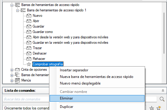 Puede personalizar la barra de herramientas de acceso rápido añadiendo, modificando o eliminando comandos.