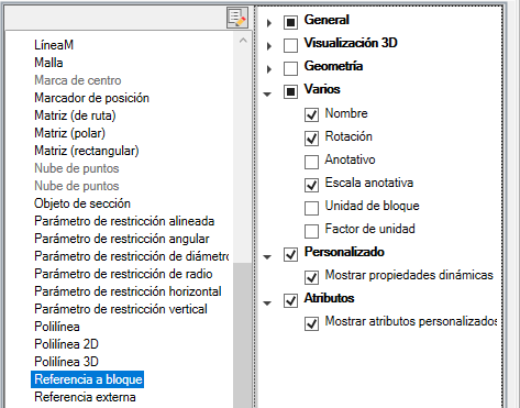 Control de la visualización de las propiedades personalizadas y los atributos para las referencias a bloque