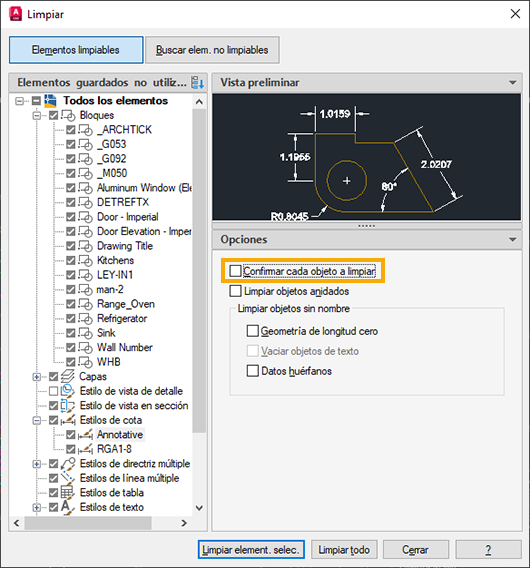 Limpiar es el término que se utiliza para describir la eliminación de una definición de un objeto no gráfico en lugar de borrar un objeto gráfico. Por ejemplo, puede borrar todos los objetos gráficos del dibujo que utilicen un tipo de línea discontinua, pero, a pesar de esto, la definición del tipo de línea permanece en el dibujo. Del mismo modo, al borrar todas las referencias a bloque de un accesorio, se conserva la definición de bloque de ese accesorio en el dibujo.
