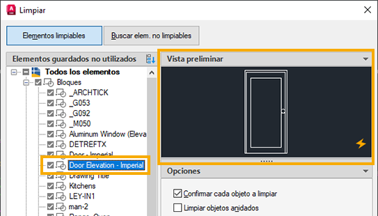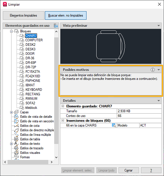 Es posible que haya un elemento que desee limpiar, pero que no aparezca en la lista Elementos guardados no utilizados. Utilice la lista Buscar elementos que no se pueden limpiar para ver los elementos guardados que se están utilizando en el dibujo.