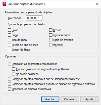 Se abre el cuadro de diálogo Suprimir objetos duplicados. Por el momento, utilizaremos las opciones por defecto.