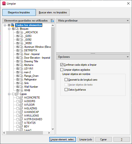 LIMPIA elimina del dibujo los objetos guardados o los elementos no utilizados, como las definiciones de bloque y las capas.