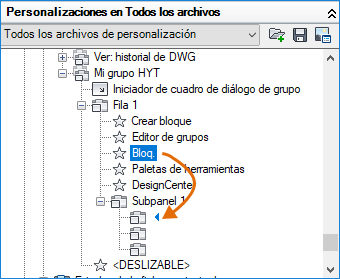 En el cuadro de texto Buscar lista de comandos del panel Lista de comandos, escriba bloque. Seleccione Crear bloque (comando BLOQUE) y arrástrelo a la fila 1 debajo de Mi grupo HYT.