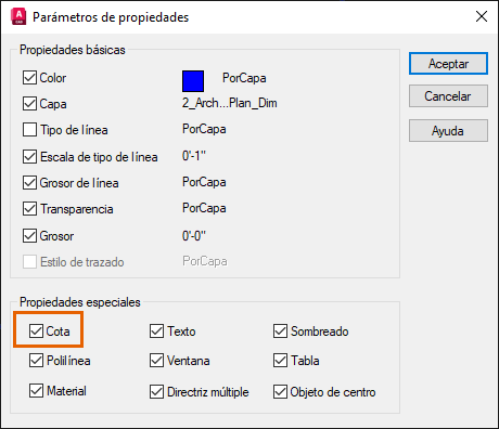 Las propiedades especiales aplican propiedades específicas del tipo de objeto de origen. Para los objetos de cota, esto incluye el estilo de cota y más.