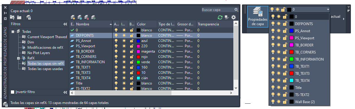 Para especificar las capas que aparecen en la lista, puede crear filtros de capas. Por ejemplo, puede definir un filtro de capas que excluya todas las capas asociadas con refX enlazadas de las que aparecen en el Administrador de propiedades de capas y la lista desplegable de capas.
