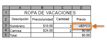 - Del mismo modo, en la celda D4, escriba =B4*C4.