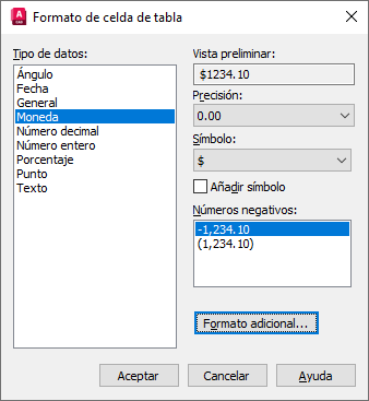 Si se ha asignado el formato de datos como Moneda, el símbolo $ aparecerá automáticamente. Las entradas de 0.00$ son necesarias como marcadores de posición para el formato. Si los valores de las columnas de Moneda no presentan el símbolo $, haga clic con el botón derecho y, a continuación, seleccione Formato de datos para cambiar el formato de datos de la celda a Moneda.