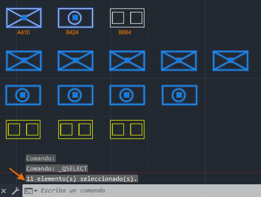 Se seleccionan todos los ejemplares de bloques A410 y B464, y se muestra un recuento preciso en la ventana de comandos.