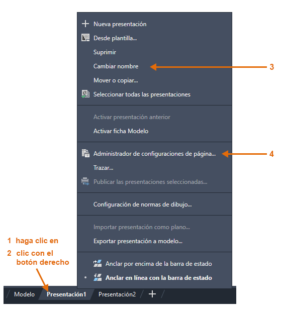Lo primero que debe hacer al acceder a una ficha Presentación (1) es hacer clic con el botón derecho en la ficha (2) y cambiar su nombre (3) por algo más específico que Presentación 1. Los nombres que hacen referencia a un tamaño ANSI o ISO específico podrían ser una buena opción.