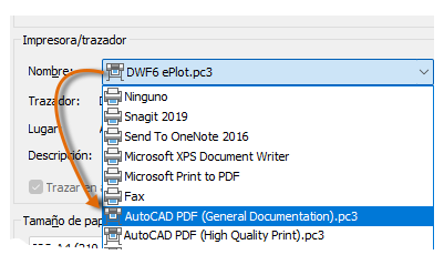 En la lista desplegable Impresora/trazador, elija AutoCAD PDF (general documentation).pc3: