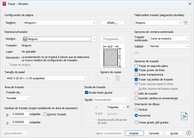 Genere una presentación del dibujo en un trazador, una impresora o un archivo. Guarde y restablezca los parámetros de la impresora para cada presentación.