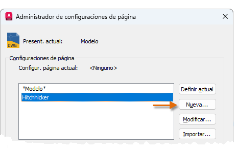 Para abrir el Administrador de configuraciones de página, haga clic con el botón derecho en la ficha Modelo o en una ficha Presentación, y seleccione Administrador de configuraciones de página. El comando es PREPPAGINA.