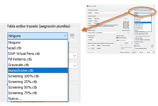 La tabla de estilos de trazado proporciona información acerca del procesamiento de colores. Los colores que se muestran correctamente en el monitor podrían no ser adecuados para un archivo PDF o para la impresión. Por ejemplo, es posible que desee crear un dibujo en color, pero generar una salida monocroma. A continuación, se muestra cómo especificar una salida monocroma: