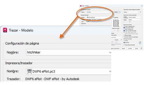 Cuando esté listo para trazar, solo tiene que especificar el nombre de la configuración de página en el cuadro de diálogo Trazar para que se restablezcan todos los parámetros de trazado. En la siguiente ilustración, el cuadro de diálogo Trazar se ha configurado para utilizar la configuración de página Hitchhiker, que permite generar un archivo DWF (Design Web Format) en lugar de imprimir en un trazador.