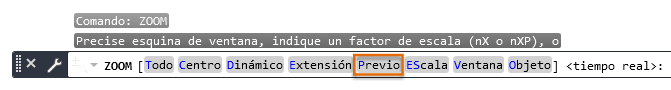 Se muestra la vista anterior. Tenga en cuenta también que, al escribir un comando o un alias de comando y pulsar a continuación la barra espaciadora o la tecla Intro, se suele abreviar con una descripción como esta: "Escriba el comando ZOOM".