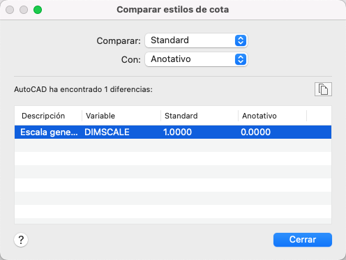 Compara las propiedades de dos estilos de cota o muestra todas las propiedades de un estilo.
