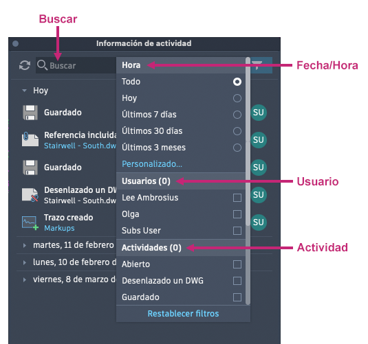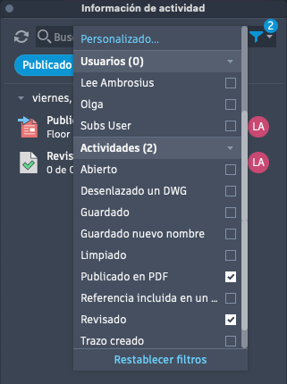 Para desactivar un filtro, seleccione las opciones Todos, Todos los usuarios o Todas las actividades en el menú desplegable de filtro.