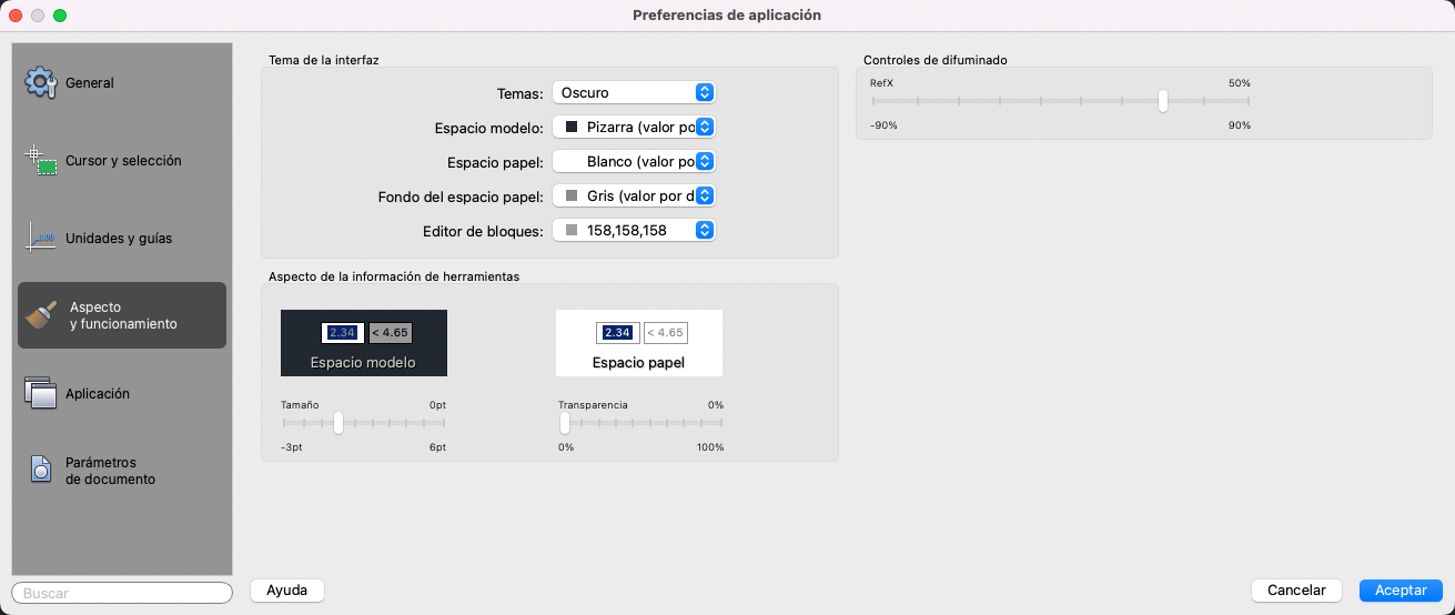 Controla el tema que aplicar a elementos como la barra de estado, las paletas y las ventanas de dibujo. Puede elegir entre un tema oscuro y uno claro.