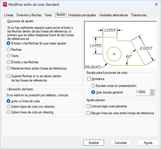 Controla la ubicación del texto y de los extremos de cota en función del espacio disponible entre las líneas de referencia.