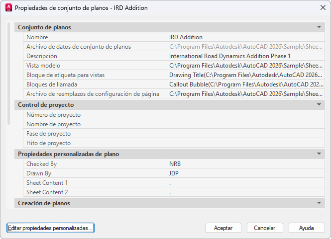 Muestra las propiedades personalizadas definidas por el usuario asociadas al conjunto de planos.