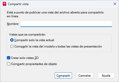 Permite asignar un nombre a la vista compartida. El nombre puede tener hasta 255 caracteres e incluir letras, números, espacios en blanco y cualquier carácter especial que no se utilice en el sistema operativo ni en el programa para otros fines.