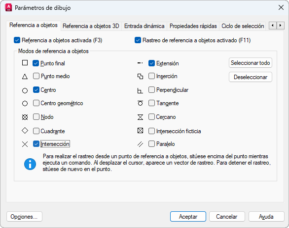 Los modos de referencia a objetos, también denominados modos refent en ejecución, permiten designar un punto en una posición exacta de un objeto. Pulse TABULADOR para desplazarse por las opciones.