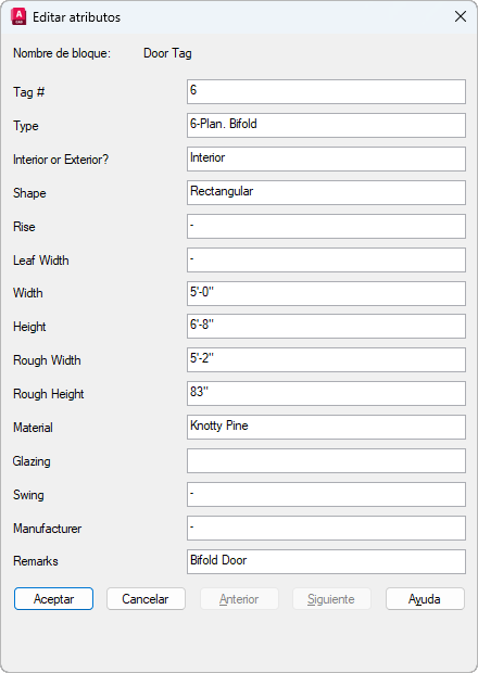 Indica el nombre del bloque seleccionado. El valor de todos los atributos incluidos en el bloque se muestra en este cuadro de diálogo.
