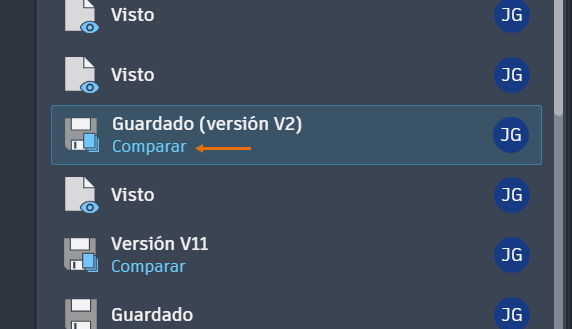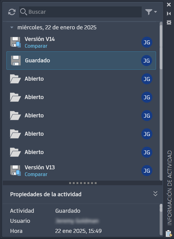 Utilice la herramienta Información de actividad para ver las aportaciones de sus compañeros de equipo a los archivos de dibujo compartidos, comparar historiales de versiones y colaborar en los productos de AutoCAD.
