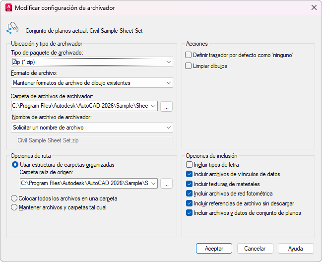 Cambia las rutas, formatos por defecto, organización y otros parámetros para un paquete de conjunto de planos archivado.