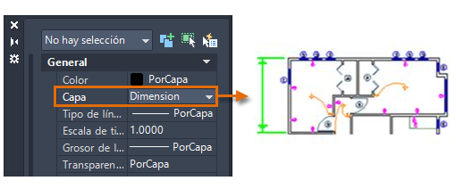 Puede definir algunas de las propiedades de un objeto por capa (PORCAPA) o especificando la propiedad de manera explícita, independientemente de su capa.