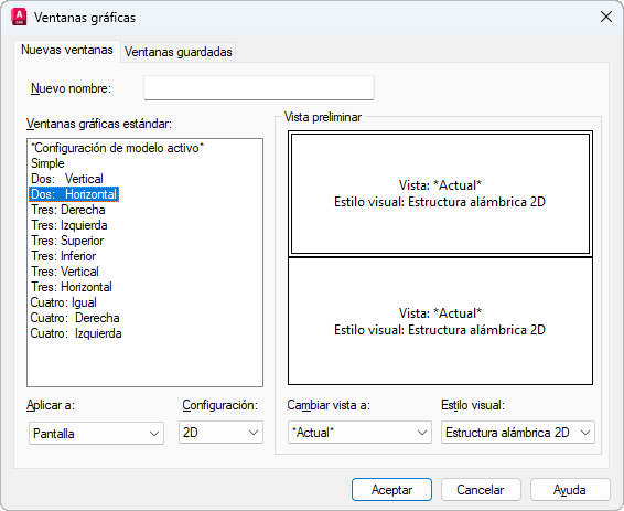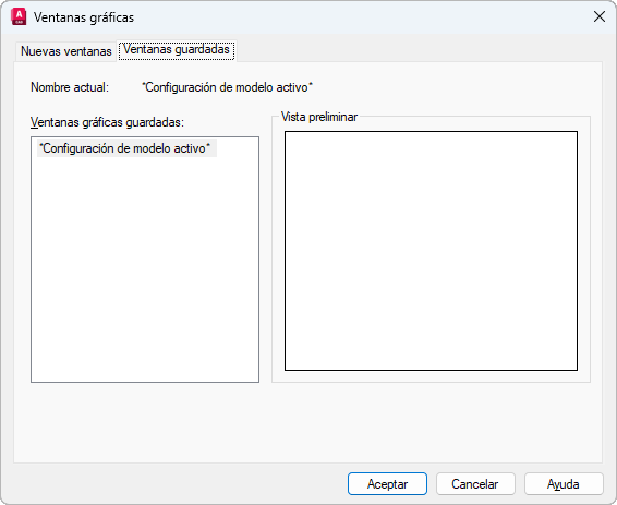 Fichas de ventanas gráficas de espacio modelo: Nuevas ventanas—Espacio modelo, Ventanas guardadas—Espacio modelo