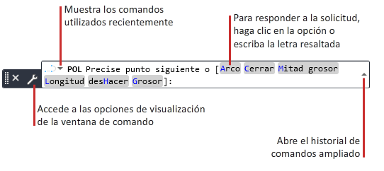 La ventana de comandos, que se puede fijar y cuyo tamaño se puede modificar, acepta comandos y variables de sistema, y muestra solicitudes que permiten completar una secuencia de comandos (incluidos los comandos que se hayan iniciado en otra ubicación como, por ejemplo, la cinta de opciones).