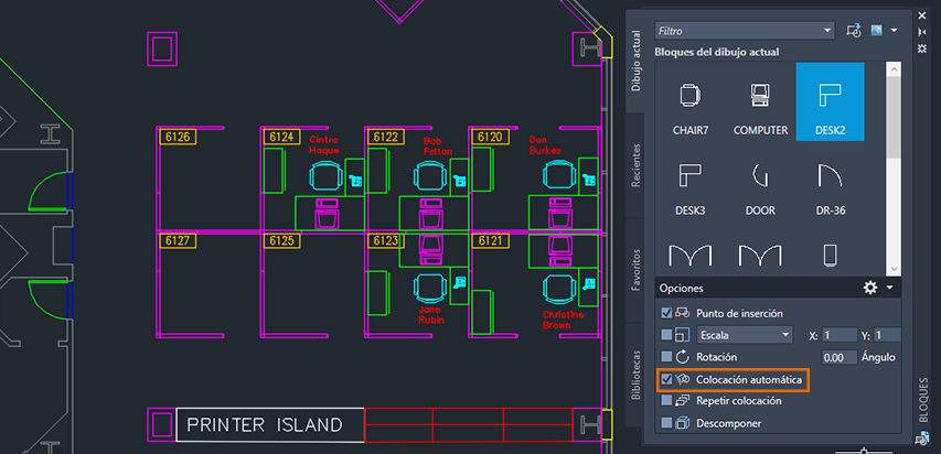 La inserción automática de bloques permite insertar bloques fácilmente mediante la paleta de bloques, lo que proporciona sugerencias basadas en geometría similar y patrones aprendidos de ejemplares de bloque anteriores del dibujo.